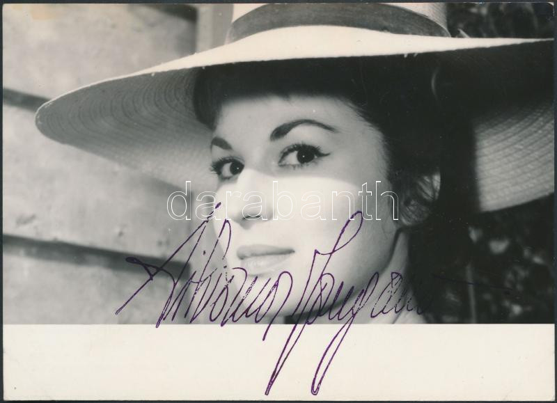 Beschreibung: Silvana Mangano (1930-1989) olasz filmszínésznő saját kezű aláírása egy a művésznőt ábrázoló fotólapon, 10x14cm