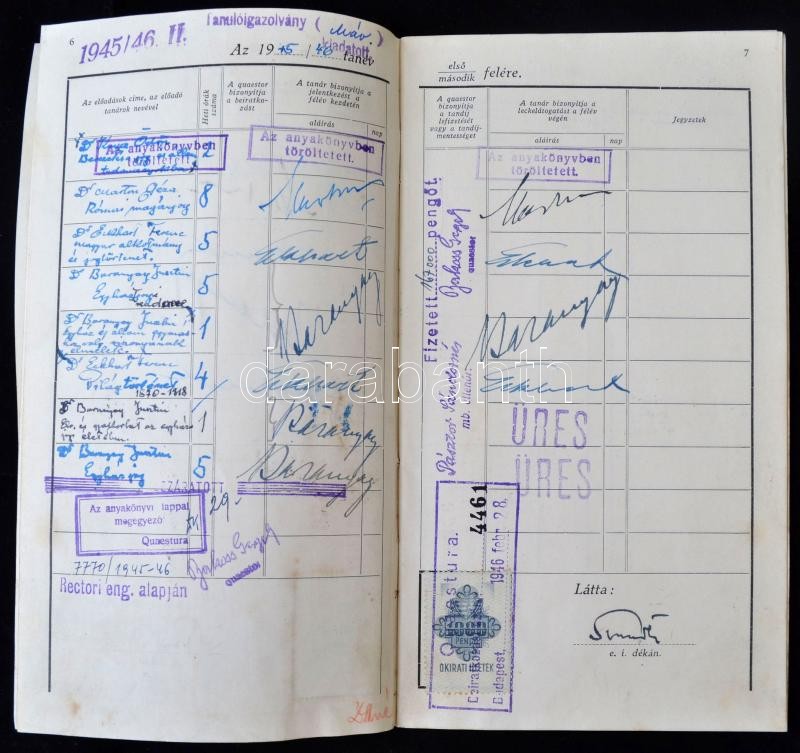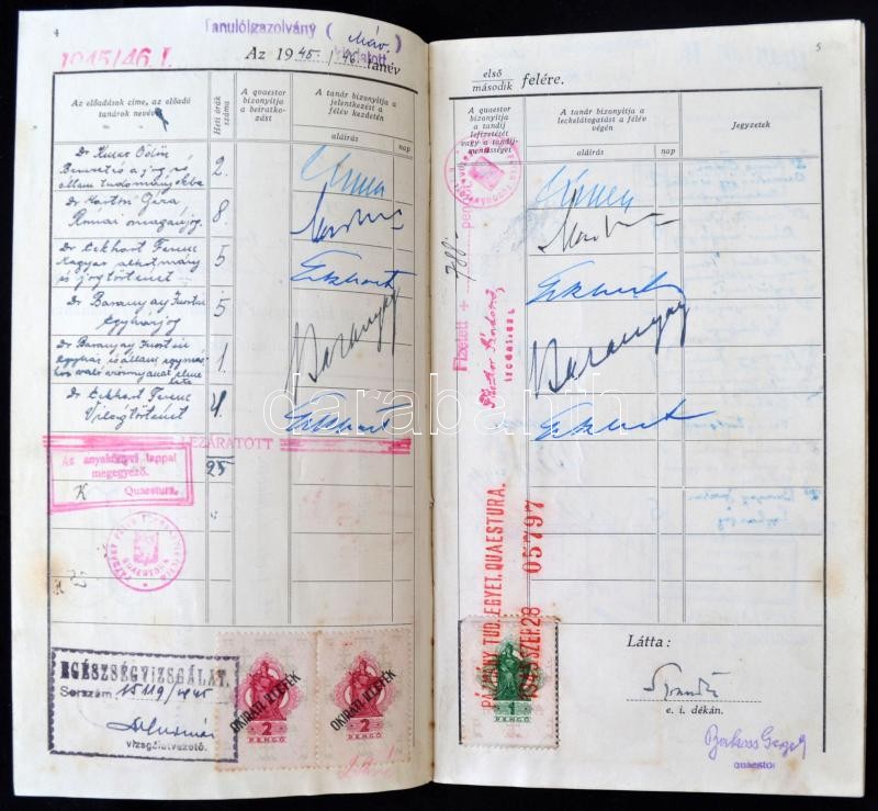 1945 Pázmány Péter Tudományegyetem leckekönyve sok aláírással, közte dr. Baranyai Jusztin, dr. Eckhart Ferenc, dr. Marton Géza, ect. Papír borításban, pp.:38, 21x11cm