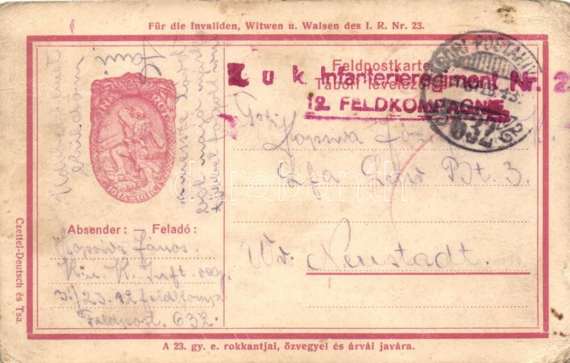 1918 Tábori posta levelezőlap alakulat címerrel 23. gyalog ezred + &qu... https://www.darabanth.com/de/261-Fernauktion/261.0/Ansichtskarten/Militaria~400076/1918-Tabori-posta-levelezolap-alakulat-cimerrel-23-gyalog-ezred-plus-TABORI-POSTA-632-23-Infa~II1263205
