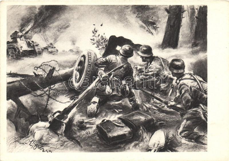 Beschreibung: Des canons allemands anti-chars repoussent une attaque de tanks / German anti-tank gun crew repels the attacking French Char B1 tanks, WWII, artist signed