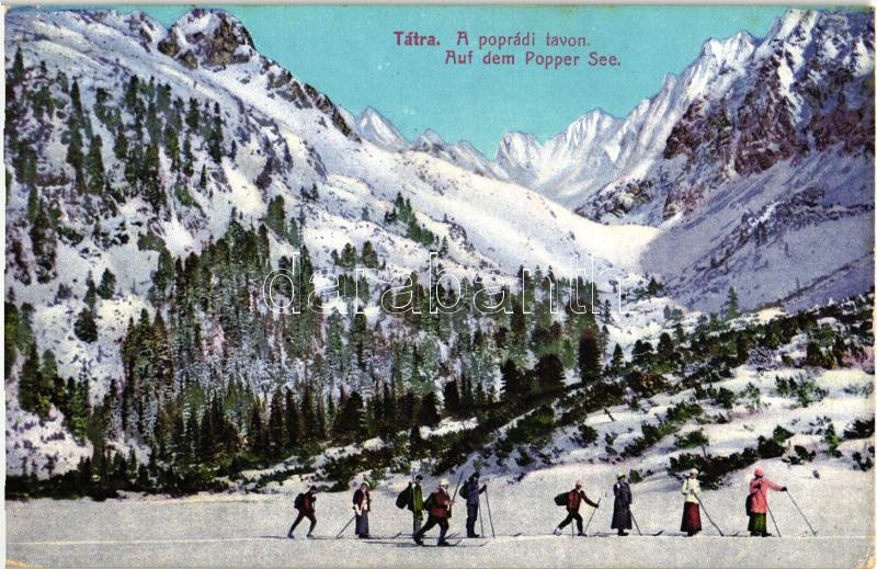 Beschreibung: Tátra, Poprádi tó, síelők, kiadja Cattarino S. utóda Földes Samu 27. sz. / skiers on the lake