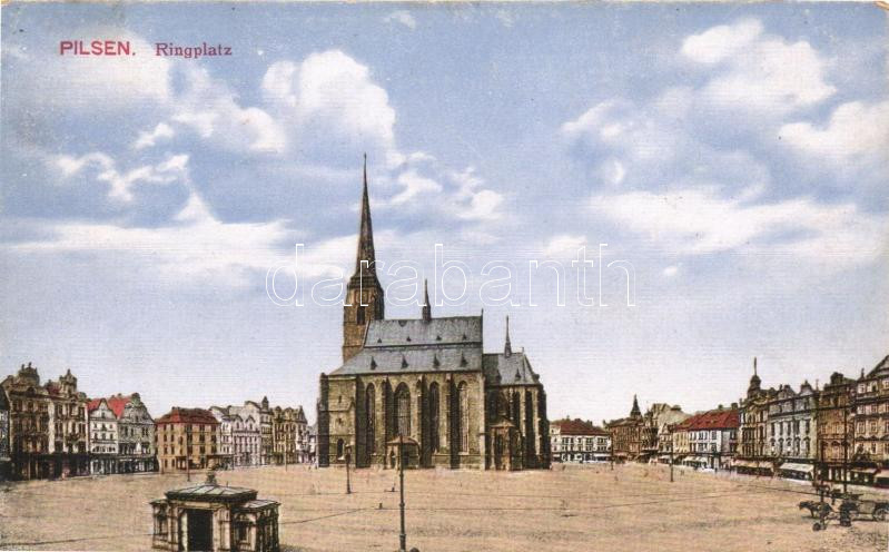 Pilsen, Plzen; Ringplatz / square with church https://www.darabanth.com/de/261-Fernauktion/261.0/Ansichtskarten/Tschechische-Republik~400020/Pilsen-Plzen-Ringplatz-square-with-church~II1292449