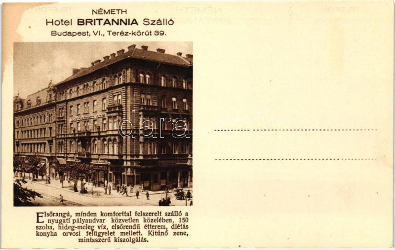 Budapest VI. Hotel Britannia; Teréz körút 39. (EK) https://www.darabanth.com/de/261-Fernauktion/261.0/Ansichtskarten/Ungarn~400006/Budapest-VI-Hotel-Britannia-Terez-korut-39-EK~II1264056