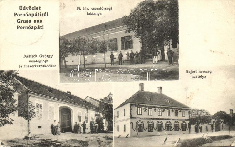 Beschreibung: Pornóapáti, Méltsch György vendéglője és fűszerkereskedése, Bajor Herczeg kastélya, csendőrségi laktanya (EK)