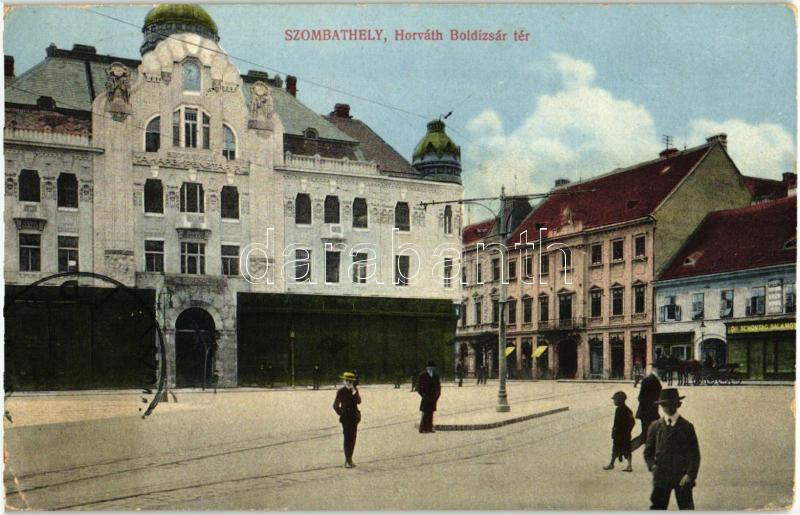 Beschreibung: Szombathely, Horváth Boldizsár tér, Özv. Schöntag Salamonné üzlete, Takarékpénztár Rt. (EK)
