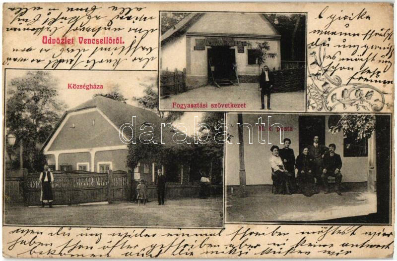 Beschreibung: Vencsellő, Gávavencsellő; Községháza, Fogyasztási szövetkezet, Posta (fa)
