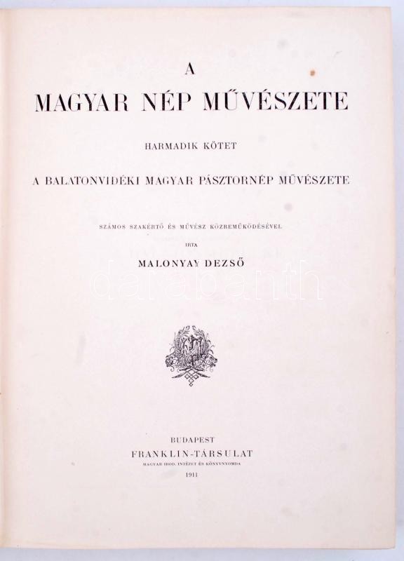 Malonyay Dezső: A magyar nép művészete. III. kötet. A balatonvidéki magyar pásztornép művészete. Bp., 1941, Franklin-Társulat. Kiadói festett egészvászon kötés, belsejében ex librisszel, gerincnél szakadt, képekkel illusztrált, kopottas állapotban.