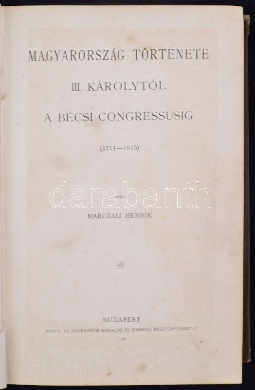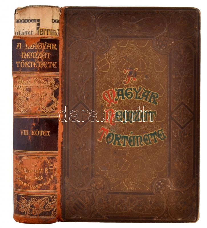 Szilágyi Sándor (szerk.): A magyar nemzet története. Nyolczadik kötet. Írta: Marczali Henrik. Budapest, 1898, Athenaeum. Díszes, aranyozott, dombornyomott kiadói félbőr kötésben. A gerinc felső részén felszakadt, hiányos, belül azonban jó állapotban, ép mellékletekkel.