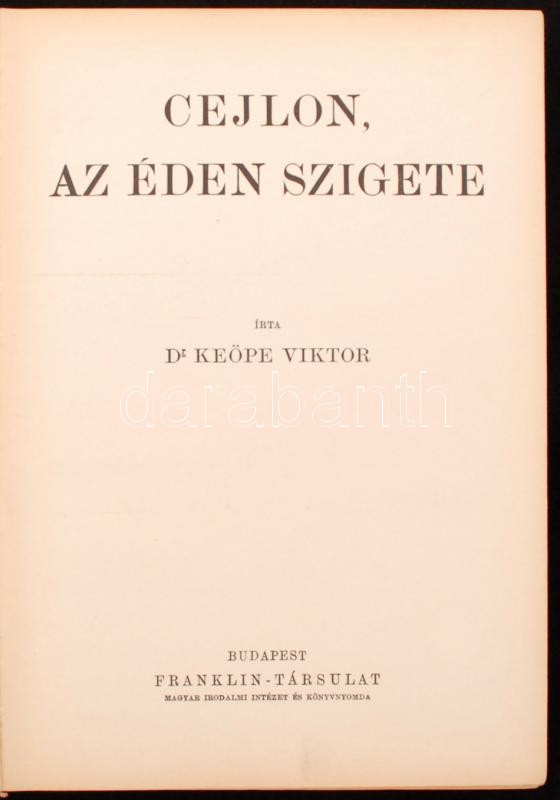 Keöpe Viktor: Cejlon, az Éden szigete. Bp., é. n., Franklin (A Magyar Földrajzi Társaság könyvtára). Kopott, díszes vászonkötésben, egyébként jó állapotban.