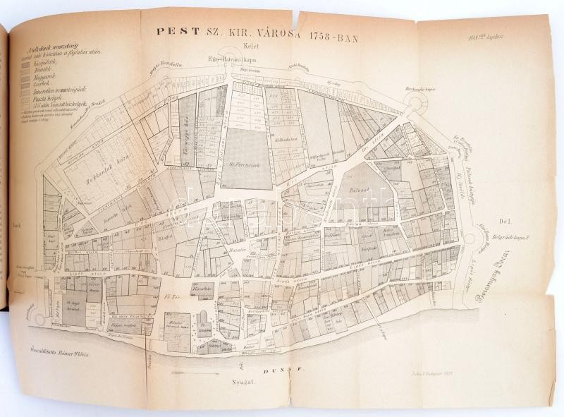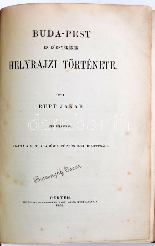 Rupp Jakab: Buda-Pest és környékének helyrajzi története. Két térképpel. Pesten, 1868. Eggenberger. X+314 p. 2 térk. Korabeli aranyozott, kissé sérült félvászonkötésben.Több lapon tulajdonosi bélyegzővel. A gerincvászon hosszanti irányban felszakadt, ezt korábban ragasztással javították, így a könyv némiképp merev tartású.