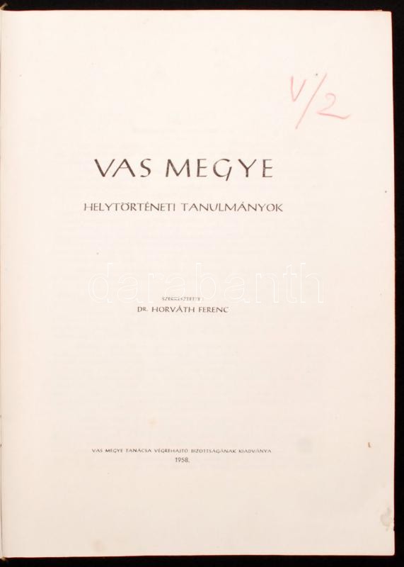 dr. Horváth Ferenc: Vas megye. Helytörténeti tanulmányok. Szombathely, 1957, Vas Megyei Tanács VB. Kiadói félvászon-kötésben, az utolsó néhány lapon apró ázásnyommal.