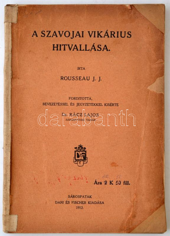 J. J. Rousseau: A szavojai vikárius hitvallása. Ford., bevezetéssel és jegyzetekkel kisérte: Rácz Lajos. Sárospatak, 1912. Dani-Fischer. 140 p. Kiadói papírkötésben, a gerince ragasztócsíkkal megerősítve.