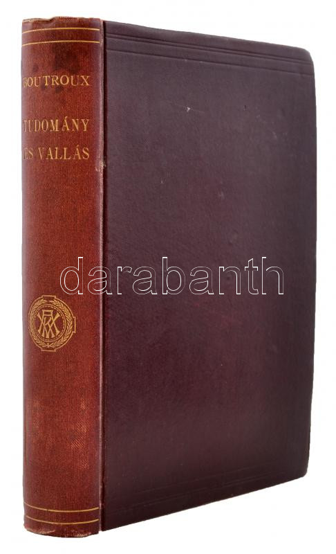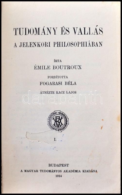 Émile Boutroux: Tudomány és vallás a jelenkori philosophiában. Bp., 1914, MTA. 433 p. Kiadói aranyozott egészvászon-kötésben. Mindkét előzék sérült, hiányos, a címlapról tulajdonosi bejegyzés kivakarva.