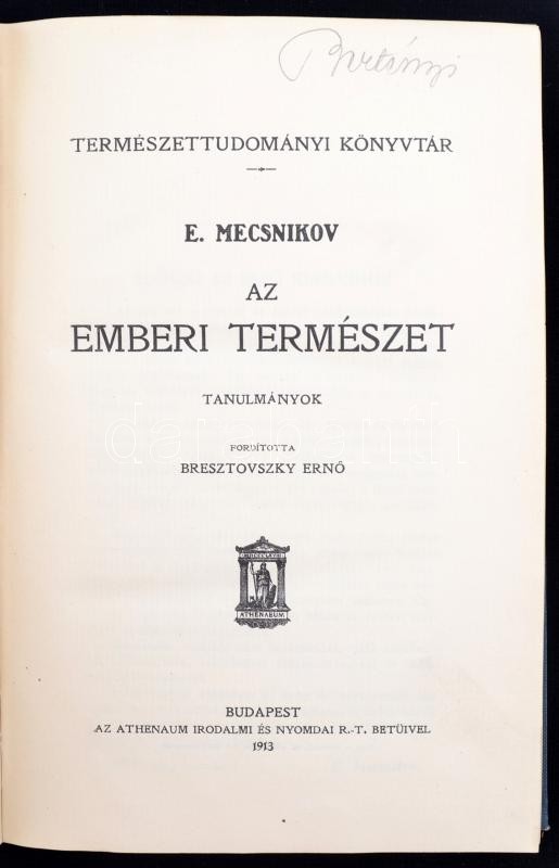 Mecsnikov: Az emberi természet. Tanulmányok. Budapest, 1913, Athenaeum... https://www.darabanth.com/de/261-Fernauktion/261.0/Bucher/Bucher-Wissenschaft-und-Technik~38/Mecsnikov-Az-emberi-termeszet-Tanulmanyok-Budapest-1913-Athenaeum-Kiadoi-egeszvaszon-soro~II1296493