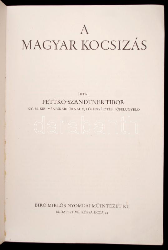 Pettkó-Szandtner Tibor: A magyar kocsizás. Bp., Bíró Miklós Nyomdai Műintézet Rt. Kiadói papírkötés, képekkel és ábrákkal illusztrált, papír védőborítóval, kissé kopott állapotban.