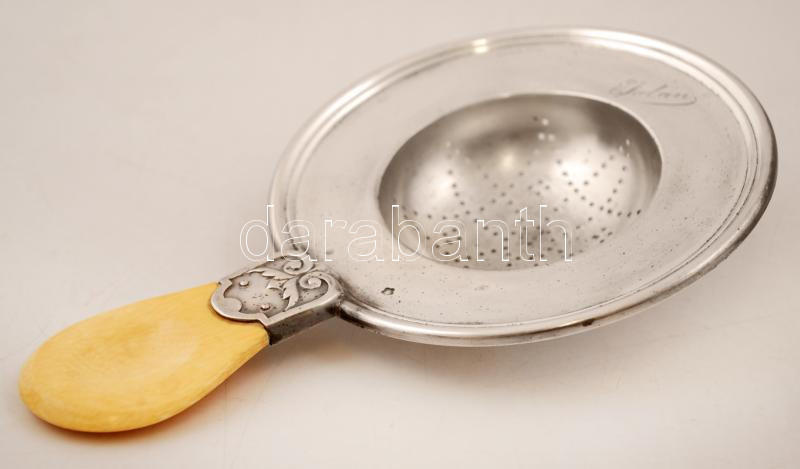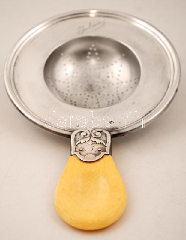 Ezüst (Ag.) teaszűrő "Jolán" felirattal, csont nyéllel, jelz... https://www.darabanth.com/de/261-Fernauktion/261.0/Juwelen/Juwelen~200053/Ezust-Ag-teaszuro-Jolan-felirattal-csont-nyellel-jelzett-br-75-g~II1291453