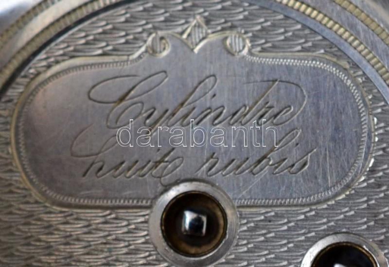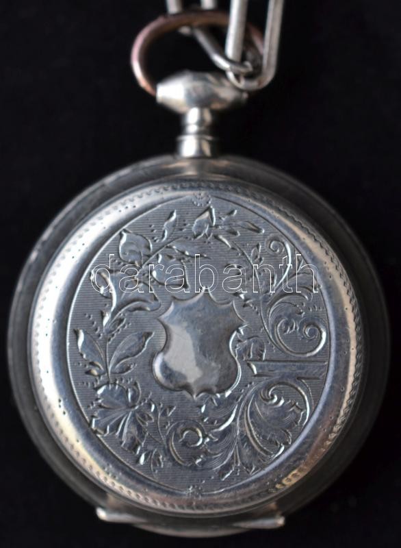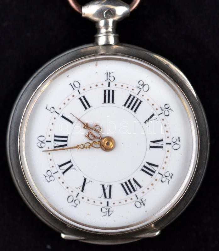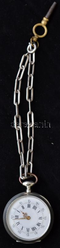 Ezüst zsebóra, kulccsal és lánccal, Cylindre huite rubis, Ag., bruttó:34,7gr., jelzett, működik, d:3cm / Silver pocket watch with key and chain, Cylindre huite Rubis, Ag, gross:.. 34,7gr, marked, operate, d: 3cm