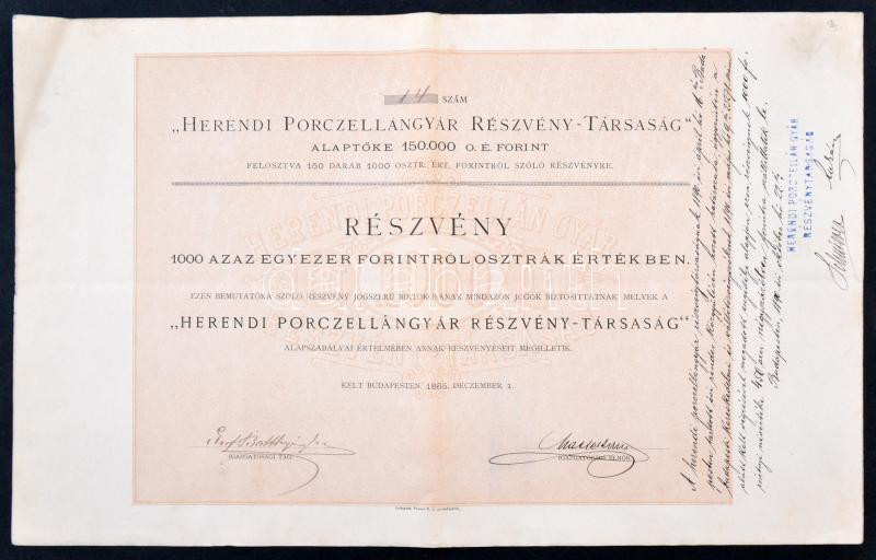 Budapest 1885. "Herendi Porczellángyár Részvény-Társaság" részvénye 1000Ft-ról bélyegzésekkel, leértékelésről szóló feljegyzéssel T:III kis lyukak, apró szakadások