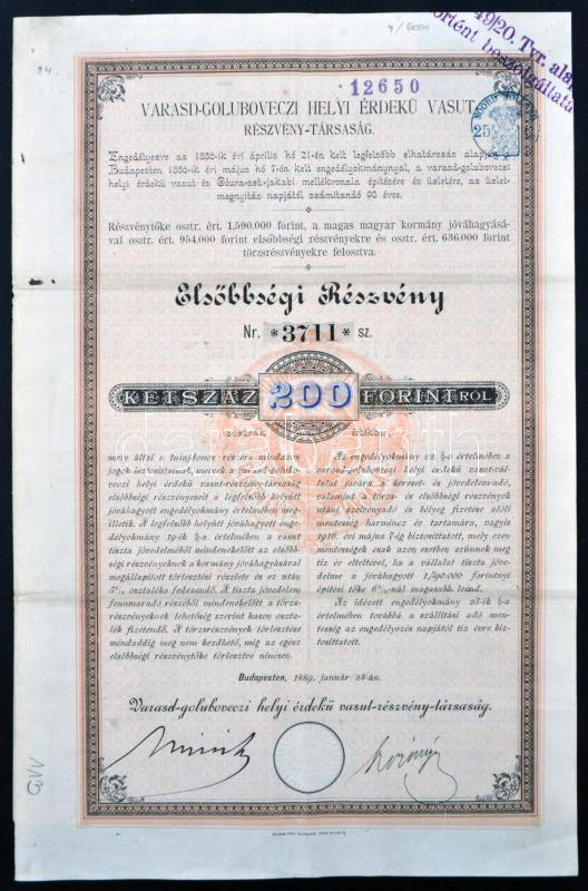 Beschreibung: Budapest 1889. "Varasd-Goluboveczi Helyi Érdekű Vasut Részvény-társaság" elsőbbségi részvénye 200Ft-ról szelvényekkel, bélyegzésekkel T:III