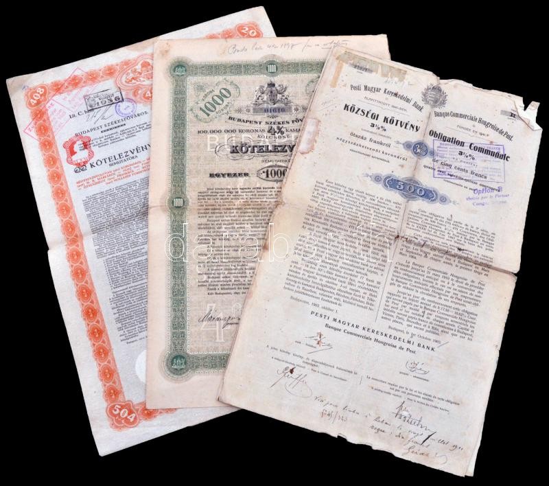 Beschreibung: Budapest 1897. "Budapest Székes Főváros" kötelezvénye 1000K-ról, szelvényekkel + 1903. "Pesti Magyar Kereskedelmi Bank" 3 1/2%-os községi kötvénye 500Fr-ról, szárazpecséttel és szelvényekkel + 1914. "Budapest Székesfőváros 4 1/2%-os Kötelezvény bemutatóra" 480K-ról szelvényekkel, felülbélyegzéssel és szárazpecséttel T:III,III-