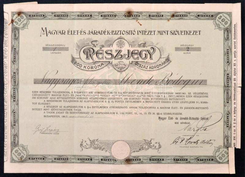 Budapest 1902. "Magyar Élet- és Járadék-Biztosító Intézet Mint Sz... https://www.darabanth.com/de/261-Fernauktion/261.0/Numismatik/Aktien-und-Tickets~300005/Budapest-1902-Magyar-Elet-es-Jaradek-Biztosito-Intezet-Mint-Szovetkezet-reszvenye-500K~II1297097