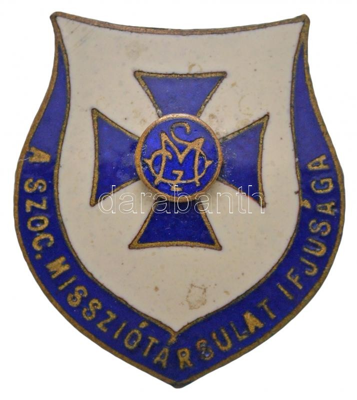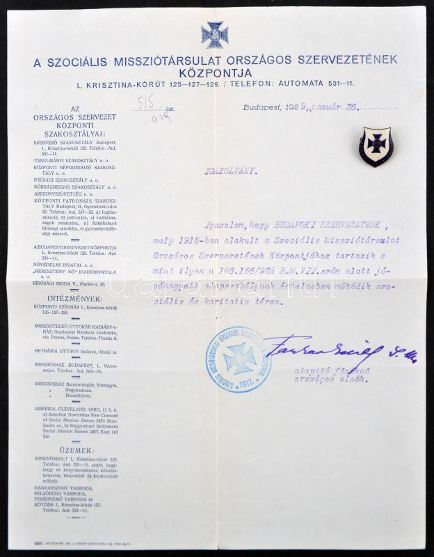 ~1920. "A Szociális Missziótársulat Ifjúsága" zománcozott fém jelvény "MORZSÁNYI BUDAPEST ESKÜ ÚT 5." gyártói jelzéssel, a "Szociális Missziótársulat Országos Szervezetének Központja" igazolványával T:2 fo.