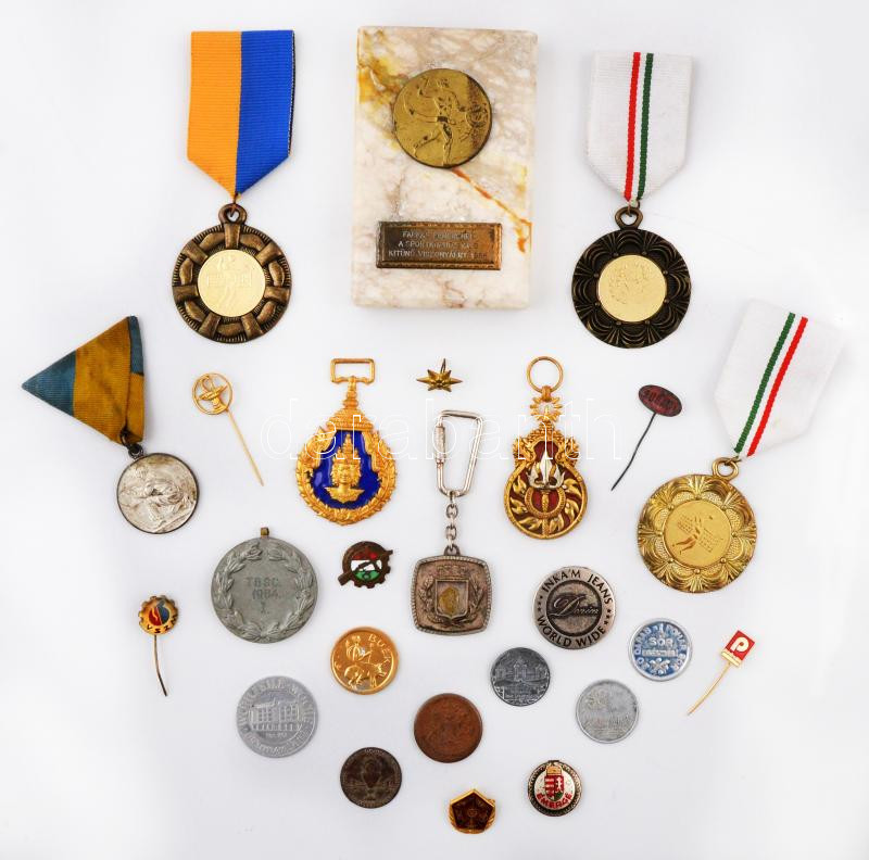 Beschreibung: 25db vegyes sportjelvény, kitüntető plakett, szerencsepénz, szocialista kitűző, jelvény, közte "Kabala 13 - Boldog újévet kívánok" Al zseton (24mm), 1933. "P.L.E: Lőverseny" ezüstözött fém díjérem "ARKANZAS BPEST" gyártói jelzéssel (30mm) T:vegyes