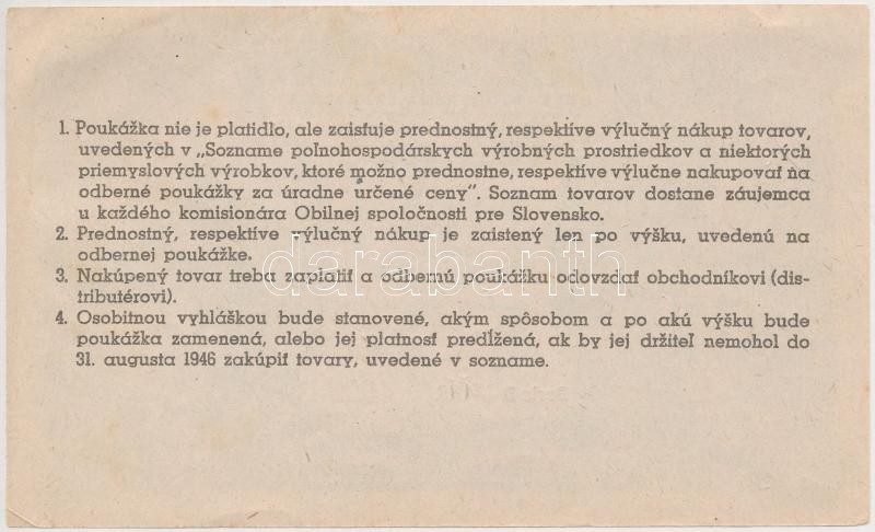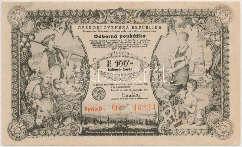 Csehszlovákia 1945. 100K utalvány "Szlovák nemzeti ellátmányozási... https://www.darabanth.com/de/261-Fernauktion/261.0/Numismatik/Notgelden~300006/Csehszlovakia-1945-100K-utalvany-Szlovak-nemzeti-ellatmanyozasi-felugyeloseg-TI---Czech~II1289245