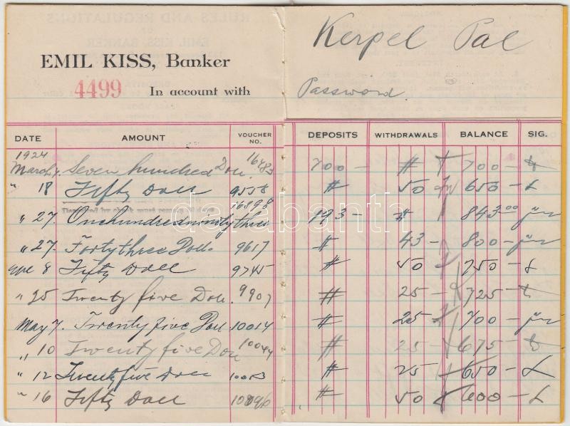 Amerikai Egyesült Államok 1924. "Emil Kiss bankár" takarékbe... https://www.darabanth.com/de/261-Fernauktion/261.0/Numismatik/Numismatische-Dokumente-und-Briefe~300003/Amerikai-Egyesult-Allamok-1924-Emil-Kiss-bankar-takarekbetetkonyve---USA-1924-Emil-Kiss-B~II1290687