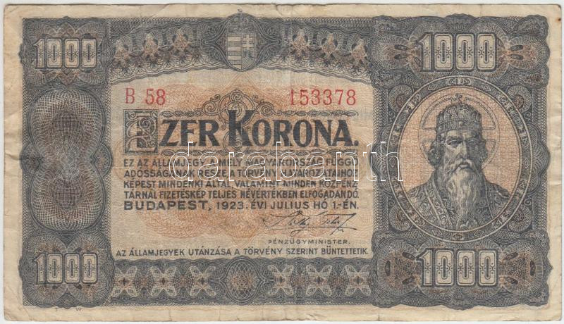 1923. 1000K "T.W." jelöléssel, nyomdahely nélkül T:III https://www.darabanth.com/de/261-Fernauktion/261.0/Numismatik/Ungarische-Banknoten~300007/1923-1000K-TW-jelolessel-nyomdahely-nelkul-TIII~II1291202