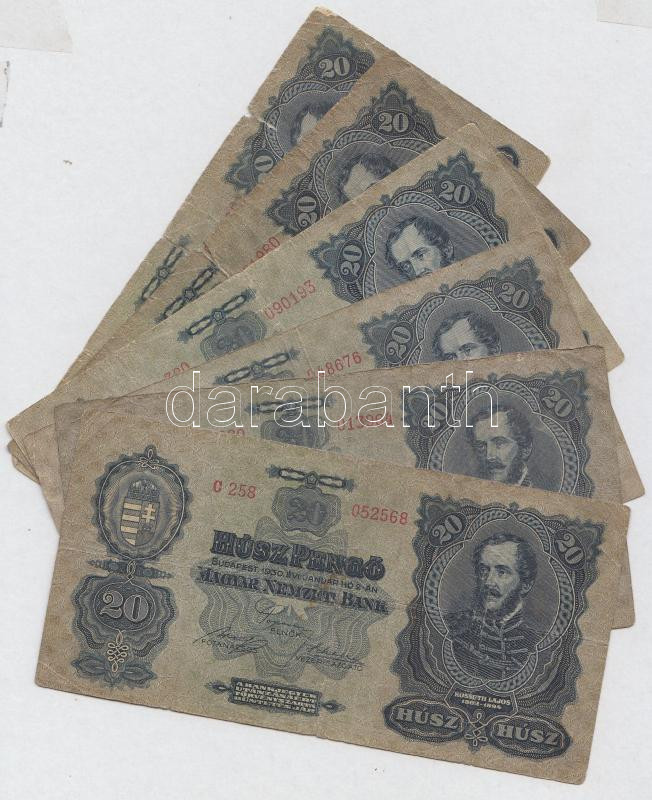 1930. 20P (6x) T:III,III- https://www.darabanth.com/de/261-Fernauktion/261.0/Numismatik/Ungarische-Banknoten~300007/1930-20P-6x-TIII-III-~II1291357