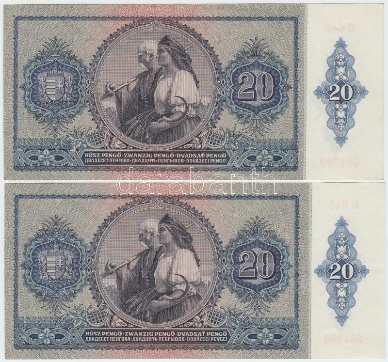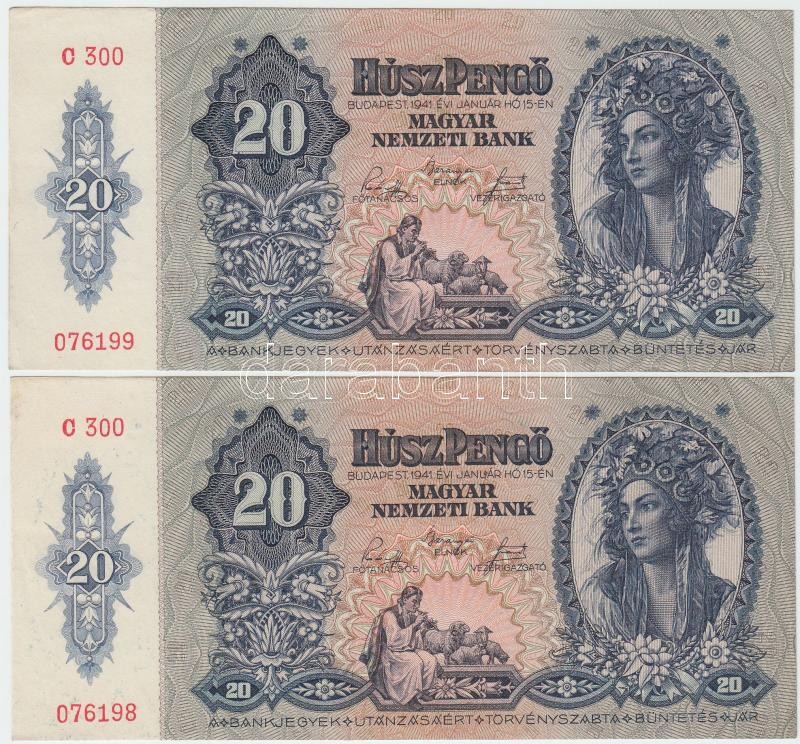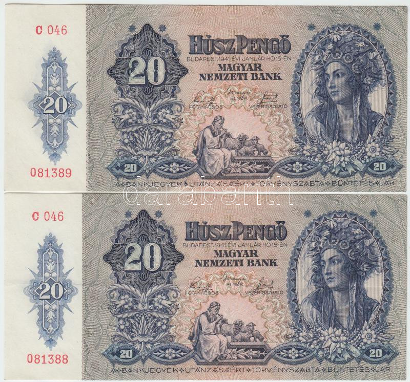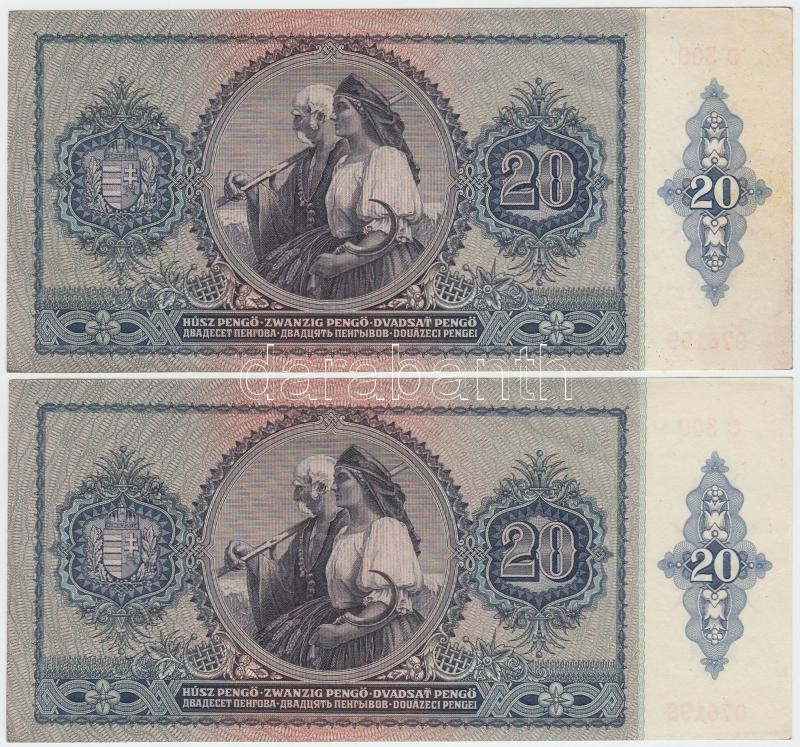 1941. 20P (4x) párban sorszámkövetők T:II,III https://www.darabanth.com/de/261-Fernauktion/261.0/Numismatik/Ungarische-Banknoten~300007/1941-20P-4x-parban-sorszamkovetok-TII-III~II1291443