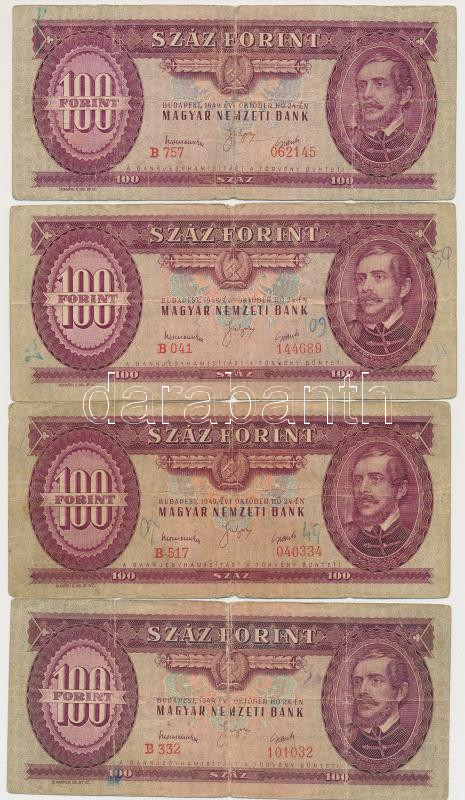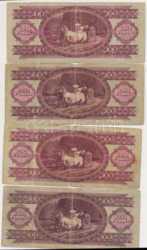 1949. 100Ft (4x) T:III,III- https://www.darabanth.com/de/261-Fernauktion/261.0/Numismatik/Ungarische-Banknoten~300007/1949-100Ft-4x-TIII-III-~II1293703