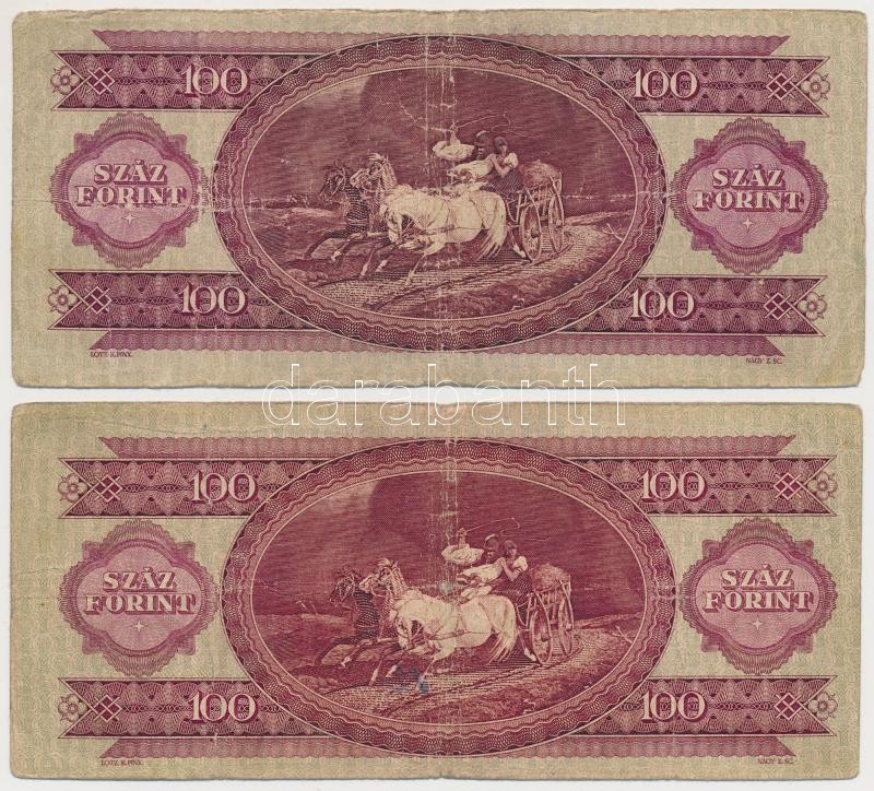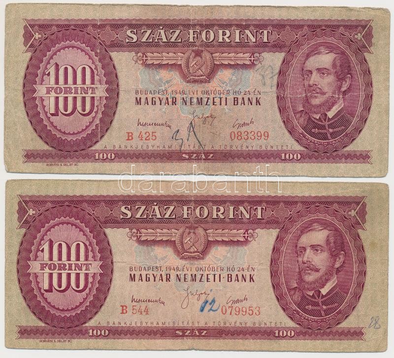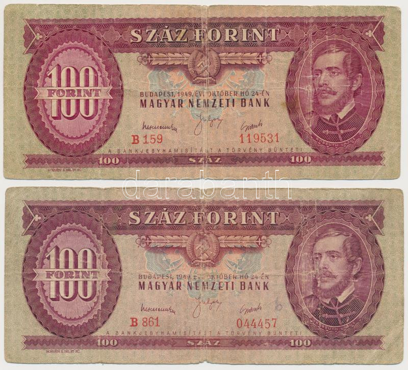 1949. 100Ft (4x) T:III,III- https://www.darabanth.com/de/261-Fernauktion/261.0/Numismatik/Ungarische-Banknoten~300007/1949-100Ft-4x-TIII-III-~II1293705