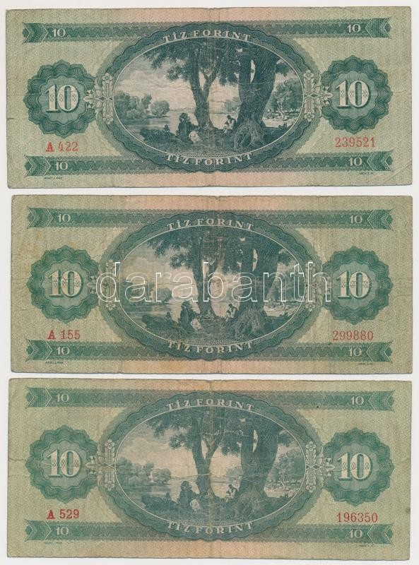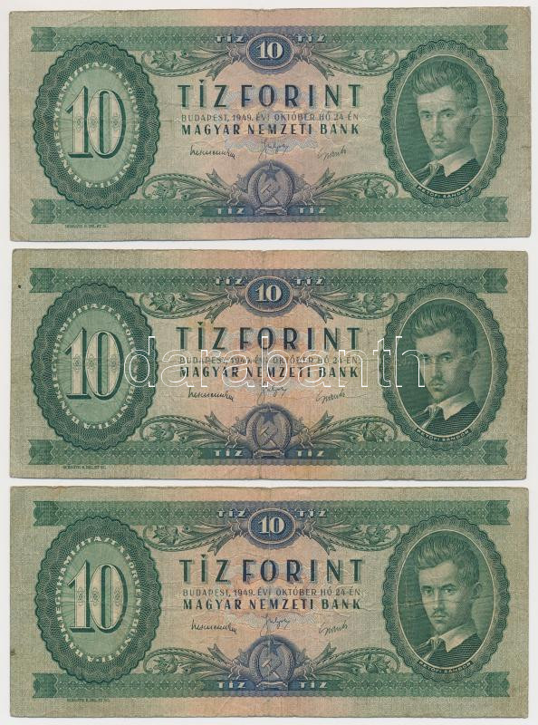 1949. 10Ft (3x) T:III,III- https://www.darabanth.com/de/261-Fernauktion/261.0/Numismatik/Ungarische-Banknoten~300007/1949-10Ft-3x-TIII-III-~II1293715