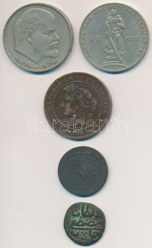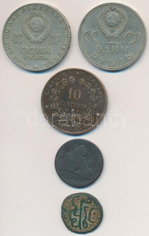5db-os külföldi fémpénz tétel, benne Belgium 1865. 2c Cu "I. Lipót", Franciaország / Modern Köztársaság 1898. 10c Br, Szovjetunió 1965-1970. 1R (2xklf) T:2,2-,3 5pcs of coins, between them Belgium 1865. 2 Centimes Cu "Leopold I", France / Modern Republic 1898. 10 Centimes Br, Soviet Union 1965-1970. 1 Rouble (2xdiff) C:XF,VF,F