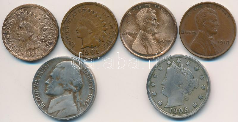 Beschreibung: Amerikai Egyesült Államok 1881-1901. 1c Br "Indián" (2xklf) + 1905. 5c Cu-Ni "Liberty Nickel" + 1909-1910. 1c Br "Lincoln" (2xklf) + 1946. 5c Cu-Ni "Jefferson" T:2,2-,3