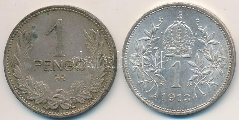Mixed: Austria 1913. 1 Corona Ag "Franz Joseph" + Hungary 1939. 1 Pengő Ag C:XF patina