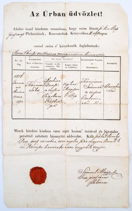 1842 Pest, A józsefvárosi plébánia által kiállított keresztlevél viasz... https://www.darabanth.com/de/262-Fernauktion/262.0/Andere-Sammelgebiete/Dokument~36/1842-Pest-A-jozsefvarosi-plebania-altal-kiallitott-keresztlevel-viaszpecsettel~II1301755