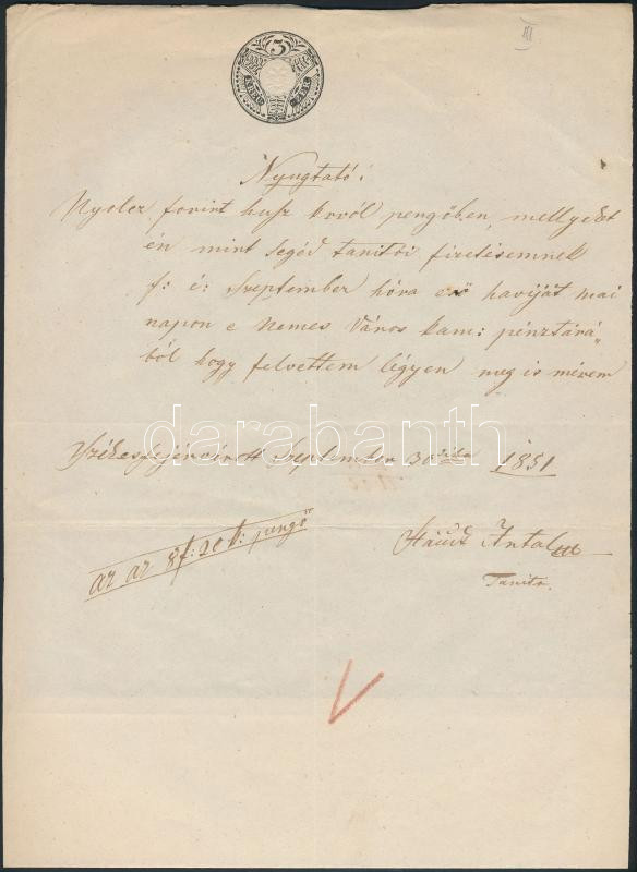 Beschreibung: 1851 Kézzel írt átvételi nyugta, 3 kr-os szignettás lapon.