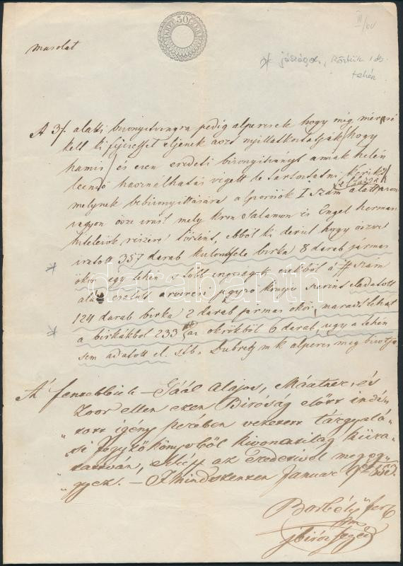 1853 Kézzel írt bírósági jegyzőkönyvi kivonat, 30 kr-os szignettás lap... https://www.darabanth.com/de/262-Fernauktion/262.0/Andere-Sammelgebiete/Dokument~36/1853-Kezzel-irt-birosagi-jegyzokonyvi-kivonat-30-kr-os-szignettas-lapon~II1302295