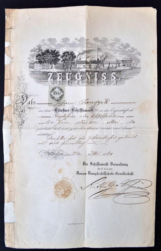 1864 Az Óbudai gőzhajógyár metszettel díszített bizonyítványa / Warran... https://www.darabanth.com/de/262-Fernauktion/262.0/Andere-Sammelgebiete/Dokument~36/1864-Az-Obudai-gozhajogyar-metszettel-diszitett-bizonyitvanya-Warrant-of-the-Donau-Dampshi~II1298621