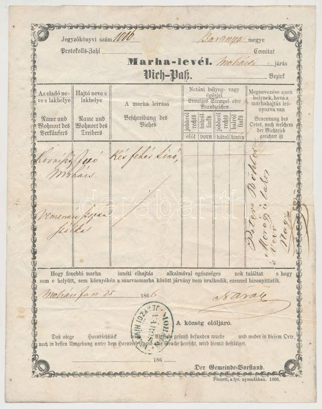 1866 Marhalevél Mohácsról, "Mohács város jegyzői hivatal" ov... https://www.darabanth.com/de/262-Fernauktion/262.0/Andere-Sammelgebiete/Dokument~36/1866-Marhalevel-Mohacsrol-Mohacs-varos-jegyzoi-hivatal-ovalbelyegzovel~II1304430