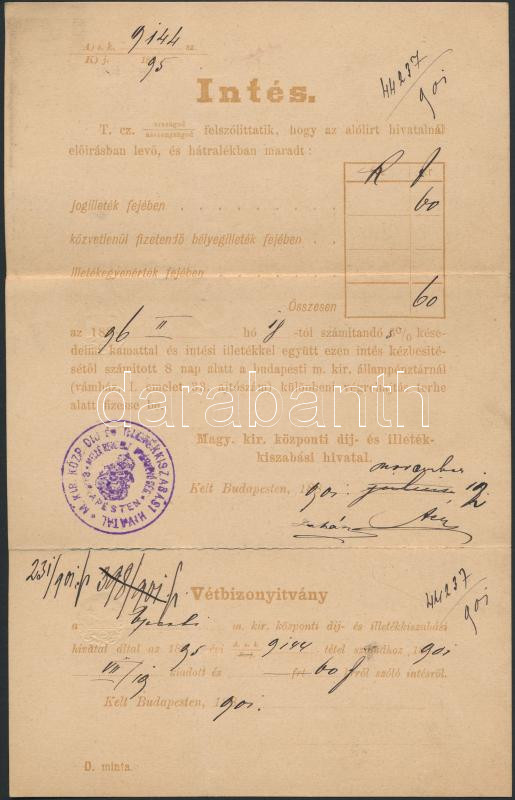 1901 Adóhivatali intés és vétbizonyítvány perforált levelezőlapként https://www.darabanth.com/de/262-Fernauktion/262.0/Andere-Sammelgebiete/Dokument~36/1901-Adohivatali-intes-es-vetbizonyitvany-perforalt-levelezolapkent~II1299301