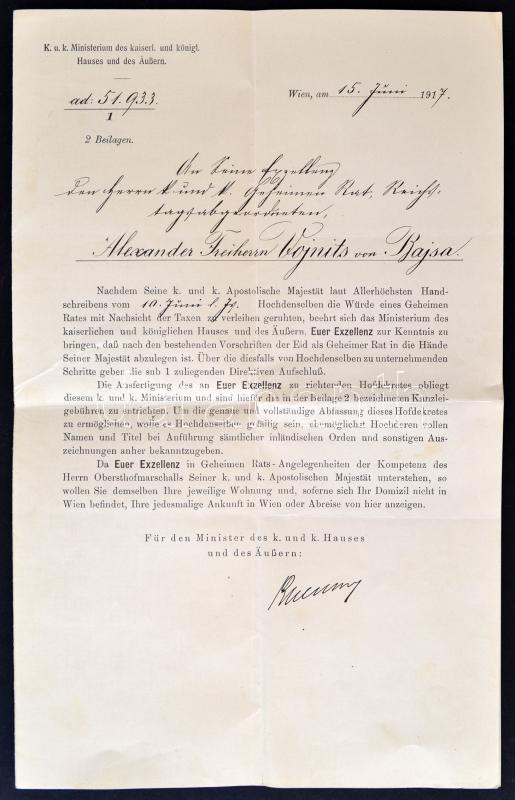 1917 Báró Vojnich Sándor főrendiházi tagnak szóló udvarmesteri levél melyben értestíik, hogy a titkos tanácsosi címhez az eskűt le kell tennie, Roszner Ervin a király személye körüli miniszer aláírásával