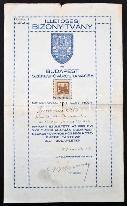1917 Illetőségi bizonyítvány előérvénytelenített okmánybélyeggel https://www.darabanth.com/de/262-Fernauktion/262.0/Andere-Sammelgebiete/Dokument~36/1917-Illetosegi-bizonyitvany-eloervenytelenitett-okmanybelyeggel~II1304114