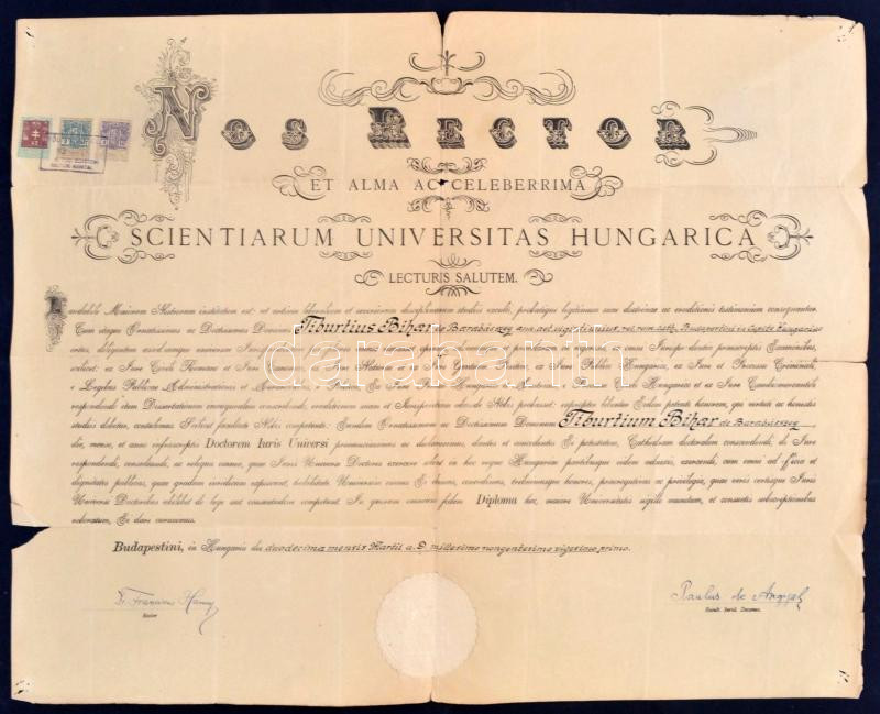1921 Jogi egyetemi diploma Angyal Pál és Hanuy Ferenc aláírásával https://www.darabanth.com/de/262-Fernauktion/262.0/Andere-Sammelgebiete/Dokument~36/1921-Jogi-egyetemi-diploma-Angyal-Pal-es-Hanuy-Ferenc-alairasaval~II1219440