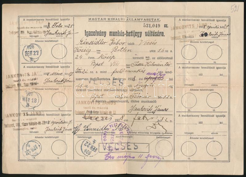 1928 Igazolvány munkás-hetijegy váltására, Magyar Királyi Államvasutak... https://www.darabanth.com/de/262-Fernauktion/262.0/Andere-Sammelgebiete/Dokument~36/1928-Igazolvany-munkas-hetijegy-valtasara-Magyar-Kiralyi-Allamvasutak-18x25cm~II1303717