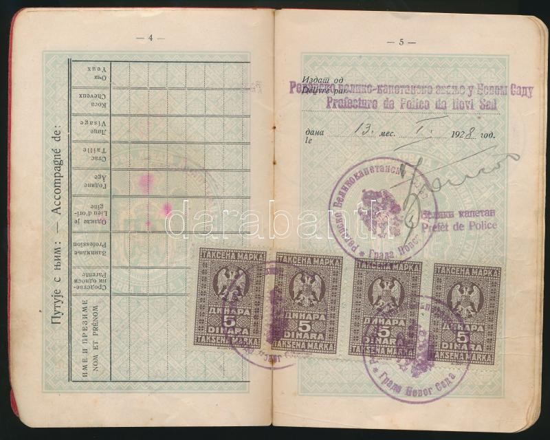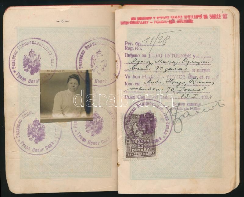 1928 Útlevél, Szerb-Horváth-Szlovén Királyság, pp.:24, okmánybélyegekk... https://www.darabanth.com/de/262-Fernauktion/262.0/Andere-Sammelgebiete/Dokument~36/1928-Utlevel-Szerb-Horvath-Szloven-Kiralysag-pp24-okmanybelyegekkel-elvalt-lapokkal-~II1305370