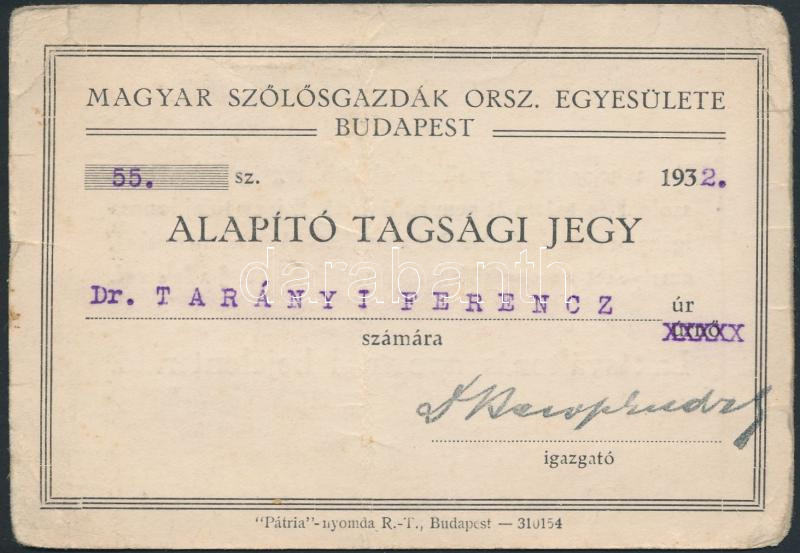 1932 Magyar Szöllősgazdák Orsz. Egyesülete. alapítói igazolvány Tarány... https://www.darabanth.com/de/262-Fernauktion/262.0/Andere-Sammelgebiete/Dokument~36/1932-Magyar-Szollosgazdak-Orsz-Egyesulete-alapitoi-igazolvany-Taranyi-Ferenc-forendihazi~II1299423